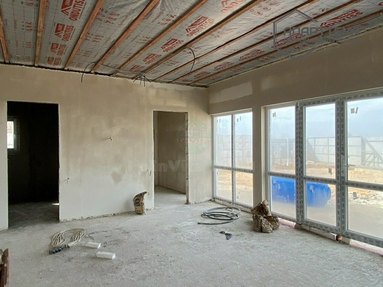 Фундамент ленточный, а сверху монолитная плита, колонны, армопояс по периметру и несущий ригель. Современный дом в стиле Хай-Тек. Высокие потолки, ПВХ окна с энергосберегающими стеклопакетами.